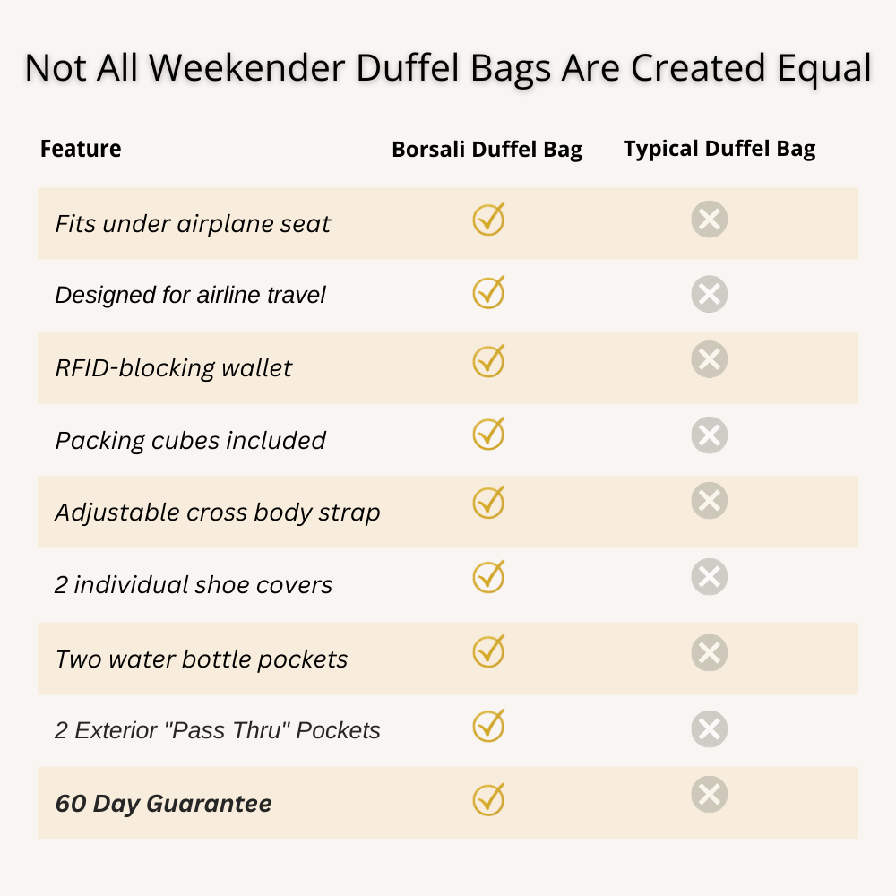 Pack and travel the way you want; This duffel bag is really more of a travel system, it includes a travel wallet, 3 packing cubes, a crossbody strap and 2 shoe covers